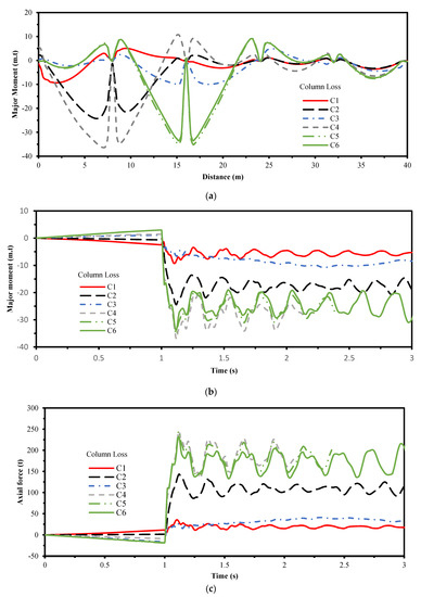 (a) Elevation, (b) displacement history above the removed column, and (c) maximum moment a long distance for the beam.