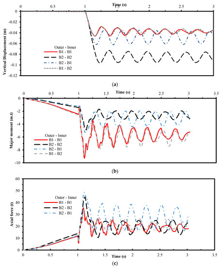 (a) Vertical displacement history, (b) major moment history for the beam, and (c) axial force history for the beam.