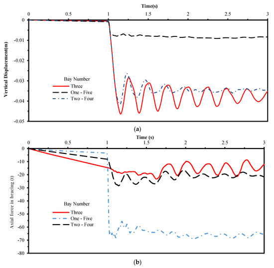 (a) Vertical displacement history, and (b) axial force history in bracing.