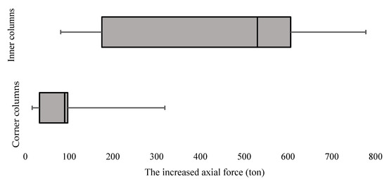 Box-whisker plots that represent the increased axial force due to the column collapse for corner and interior columns.