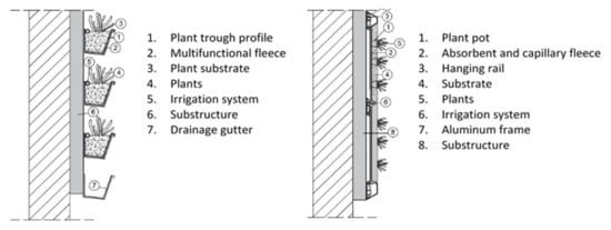 In order to evaluate the effect of the façade greening systems on the surface temperatures, sensors were installed at different positions. For this purpose, façade greening systems based on both the aluminum troughs and cassettes were considered, as shown in Figure 1.