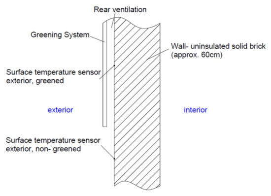 On the façade, the surface temperatures were measured using PT 1000 sensors behind the greening systems and as a reference, near the non-greened façade. The sensors have a measuring accuracy of ± 0.35 °C. The measuring points are shown schematically in Figure 6.