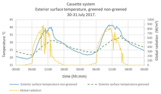 Cassette system, exterior surface temperature, greened and non-greened, 30–31 July 2017.