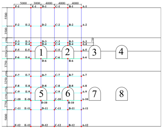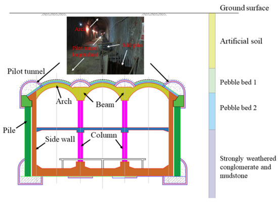 An in-depth study is conducted in the previous content [15]. Daguanying Station of Beijing Metro Line 7 is in an underground and double-decker island platform style, 236 m in length, 22.9 m in width, as well as 15.15 m in height. The overburden thickness of the vault is nearly 9 m. The station is constructed using the Pile-Beam-Arch method (Figure 1) and passes through four soil layers, i.e., pebble layer 1, pebble layer 2, artificial soil, and strongly weathered conglomerate and mudstone. When the PBA method is adopted, numerous steps are involved. The first step is the excavation of small pilot tunnels. The existing research [10,11,12,13,14,15] suggested that the settlement caused by the pilot tunnel excavation is the largest in the whole construction. Thus, the pilot tunnel excavation is the critical step if the final settlement caused by the subway excavation is minimized. Thus, this study uses eight pilot tunnels (4 upper and 4 lower) in the construction of pilot tunnels. The pilot tunnels are located in pebble layer 1, pebble layer 2, as well as significantly weathered conglomerate and mudstone.