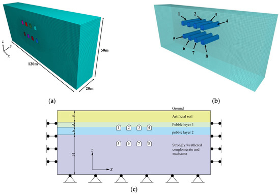 Model for numerical simulation: (a) numerical model, (b) primary linings of the pilot tunnels and (c) boundary condition of the numerical model (unit: m).