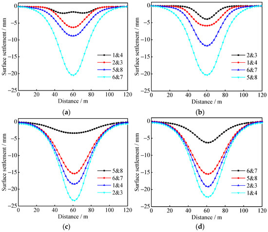 Ground surface settlement in the four excavation plans: (a) 1&4→2&3→5&8→6&7, (b) 2&3→1&4→6&7→5&8, (c) 5&8→6&7→1&4→2&3 and (d) 6&7→5&8→2&3→1&4.
