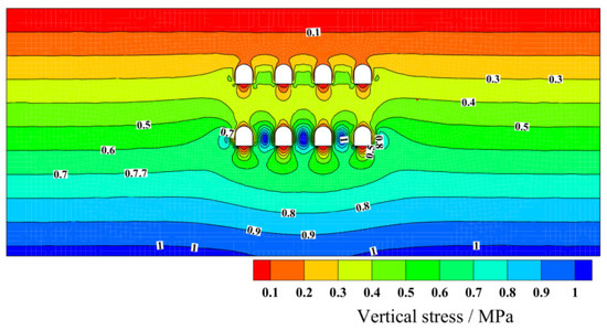 The curves of the settlement troughs formed by the four excavation options suggest that the excavation of pilot tunnels in the low layer generates more surface settlement. The surface settlement in the excavation of pilot tunnels 6&7 accounts for 57% and 52% of the total settlement, respectively, for plan 1 and plan 3. For plan 2, the excavation of pilot tunnels 5&8 and 6&7 accounts for 42% and 29% of the final ground surface settlement. Plan 2 is also consistent with the above law, accounting for 41% and 28%, respectively. The above phenomenon is achieved primarily because the burial depth of the lower pilot tunnels is large, and the excavation of the pilot tunnels will form significant stress concentrations (Figure 4) around the pilot tunnels, and the “group cavity effect” generated after multiple pilot tunnels are excavated will increase this stress concentration, thus making the lower pilot tunnels under greater stress and resulting in larger deformation. As a result, the support strength of the lower pilot tunnels can increase appropriately during the construction of the pilot tunnels to increase construction safety and reduce the ground surface settlement.