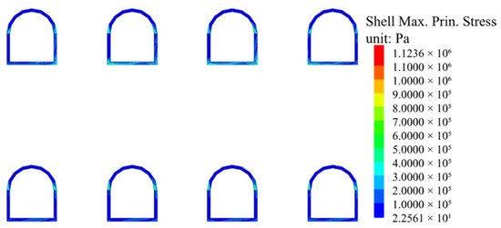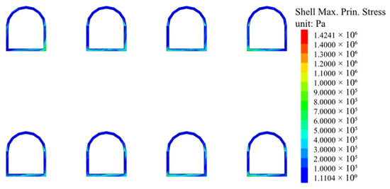 After the excavation of the pilot tunnels, the maximum principal stress distribution of the temporary support system of the pilot tunnels is shown in Figure 6. As can be seen from the figure, the maximum principal stress distribution is different for different locations of the pilot tunnels and different locations of the same pilot tunnel, and the maximum principal stress value is 1.124 MPa. For the upper pilot tunnel, the maximum principal stress is mainly concentrated at the bottom and the arch waist of the pilot tunnels, and the maximum principal stress value in the middle pilot tunnel is greater than the two sides, and it is widely distributed around the pilot tunnel, which is caused by the group tunnels effect. For the lower pilot tunnels, the maximum principal stresses are distributed equally, and the maximum principal stresses are all located at the arch waist of the pilot tunnels. From this, it can be seen that under the action of static load, the upper pilot tunnel is more affected and the structure is not uniformly stressed, so the support of the upper pilot tunnel should be strengthened during the static excavation.