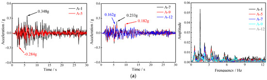 As depicted in Figure 10, the acceleration curves of the respective measurement point under the action of seismic wave of 0.15 g are nearly the same, whereas the peak and the time to reach the peak acceleration of the respective measurement point are difficult. Compared with the input seismic wave, the time to reach the peak acceleration of the respective measurement point has a certain degree of lag, suggesting that when the seismic load is small, the seismic wave in the transmission process dissipates the energy and delays the peak time of seismic waves due to the presence of damping of the surrounding rock and the supporting structure of the pilot tunnels.
