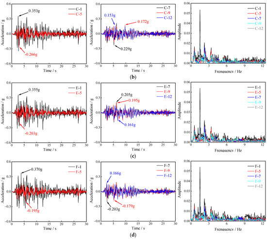 The acceleration time curve of the selected measurement points suggests that the peak acceleration of the respective measurement point increases as the relative elevation increases. For A, the peak acceleration increases from 0.162 g to 0.348 g; for C, the peak acceleration increases from 0.153 g to 0.353 g; for E, the peak acceleration increases from 0.161 g to 0.355 g; for F, the peak acceleration increases from 0.166 g to 0.370 g. The above results indicate that there is an amplification effect of acceleration along the elevation. However, in the horizontal direction, the amplification effect of acceleration varies among the measurement points at the same height due to the different locations of the measurement points.