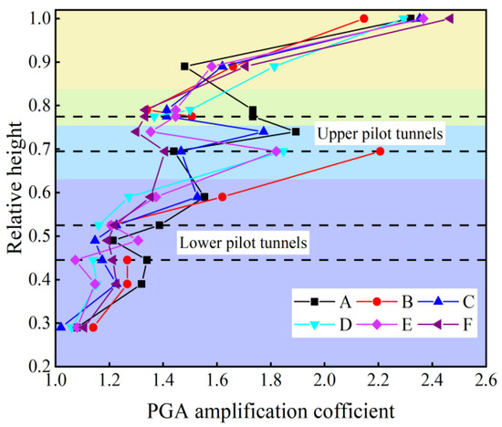 As depicted in Figure 11, under the seismic excitation, the horizontal PGA amplification coefficient of surrounding rock increases with the increase in the elevation, which prevents significant nonlinearity. The PGA amplification coefficient is always in the increasing-decreasing cycle, whereas that maximum is significantly located on the ground surface. The PGA amplification coefficient decreases when the seismic wave propagates through upper pilot tunnels and lower pilot tunnels. Notably, the upper and lower pilot tunnels have a certain amplification effect on the seismic waves, and the amplification effect is significant in the middle of the two pilot tunnels and the upper pilot tunnels, so the acceleration response around the upper pilot tunnels is larger than that of the lower pilot tunnels. Thus, the upper pilot tunnels should be the vital object of observation in the seismic design process, suggesting that there are regional differences in acceleration response in space due to the relationship between the location of the pilot tunnels and the effect of the stratigraphic parameters.