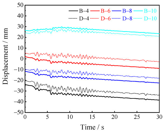 Figure 13 shows the vertical displacement of the number one, number two, number five and number six pilot tunnels’ vault and bottom with time. As depicted in the above figure, when under horizontal seismic excitation, the horizontal acceleration also produces displacement components in the vertical direction. At 0~15 s, the vertical displacement of pilot tunnels at the top and bottom fluctuates in a certain range due to the large acceleration amplitude; at 15~30 s, this fluctuation tends to disappear, and the vertical displacement changes approximately linearly with time. The displacement changes of the monitoring points at the top and bottom of pilot tunnels show that their relative displacements remain nearly unchanged, suggesting that the vertical displacement response of the pilot tunnels and the neighboring soil is nearly the same.