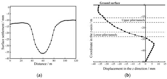 Vertical displacements of the grid points following a symmetry axis (x = 0 y = 10) of the model are plotted against the z-coordinates when the above four options are adopted to excavate the pilot tunnels, as presented in Figure 5. Settlements and uplifts are identified above and below the pilot tunnels. With the excavation of the pilot tunnels, the position of the displacement zero point (the transition point between positive values and negative values) is in a dynamic process, and the overall trend is to move into the deeper stratum. After the excavation, the maximum settlements are located close to the upper pilot tunnels, and the maximum uplifts are located close to the lower pilot tunnels.