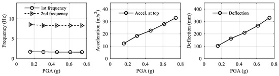 Figure 23 graphically shows the trends in responses of acceleration, deflection, bending moment and stress. The structural frequencies were stable amongst different excitation levels of testing, with a mild decreasing rate of 5% from 1.73 Hz to 1.64 Hz. Acceleration, deflection, and moment of bending were linear to the applied PGA, indicating the specimen mostly responded in a linear elastic range.