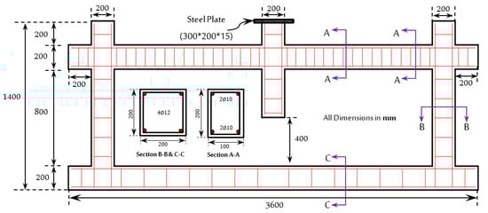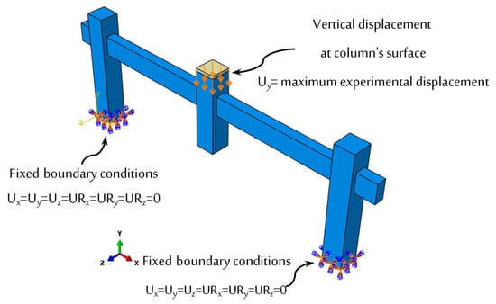 Figure 9 shows specifics on the loading application and boundary conditions of all the specimens. A strip foundation was used in the experimental program to support the tested specimens in the laboratory. The strip foundation was not taken into account in the FE modelling because it requires more demanding computations, and it is assumed to be stiff enough to provide rigid support. Therefore, at the external columns’ bottom surfaces, the supports were implemented by the fixed boundary condition for all rotations (UR) and translations (U) in all directions (i.e., URx, URy, URz, Ux, Uy, and Uz were restrained). By increasing the displacement at the top surface of the middle column (acting vertically downwards), the experimental loading was applied to the middle column until the entire test specimen failed.