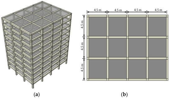 Typical plan and 3D view of the building considered in this study: (a) three-dimensional view; (b) floor plan.