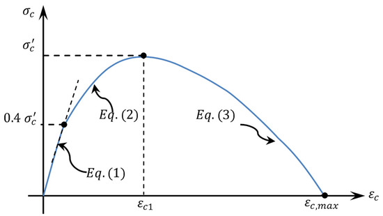 The stress–strain curve for the concrete uniaxial compression behavior can be separated into three zones, as shown in Figure 4. Up to a compressive stress of , the first portion of the curve exhibits an ascending linear elastic behavior. Up until the maximum compressive stress, the second portion of the curve exhibits an increase in strain with the stress in a non-linear fashion. The third portion of the curve is characterized by a non-linear softening model (i.e., declining) as a result of the decreased concrete capacity, as shown in Figure 4. For the non-linear FE studies, Hognestad [57] proposed a uniaxial compressive concrete model similar to that shown in Figure 4. Additionally, Stoner [58] modified the third portion of the curve shown in Figure 4 to take into account the impacts of maximum concrete strain and concrete confinement by stirrups. Figure 4 depicts the relationship between concrete compressive stress () and concrete compressive strain () with Equations (1)–(3) describing this relationship [57,58].