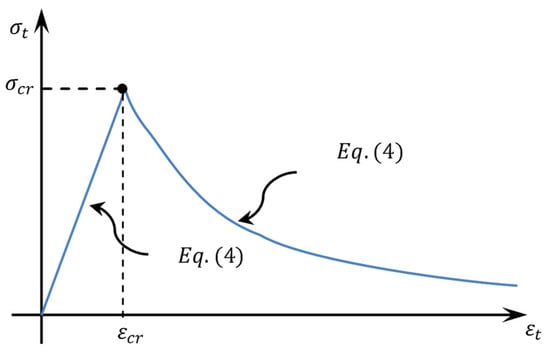 Regarding modelling the tension behavior of concrete, until cracking stress the behavior is linear elastic (i.e., rising), then the non-linear stress–strain curve (i.e., softening) starts to descend due to the decrease in concrete strength as shown in Figure 5. The tension behavior of concrete is described by Equations (4) and (5) as described elsewhere [59].