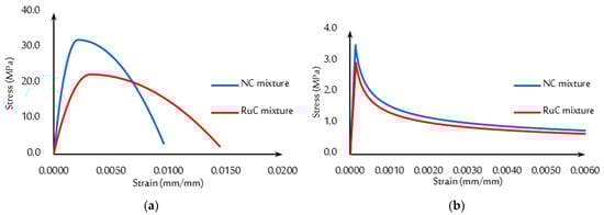where = tensile stress of concrete; = cracking stress of concrete ( according to ACI 318M-11 [52]); = tensile strain of concrete; = cracking strain of concrete (i.e., strain at ). The stress–strain curves, which were calculated according to the previous equations for the NC and RuC mixtures under compression and tension, are shown in Figure 6. As a result of the addition of crumb rubber (i.e., RuC), the strain increased even though the maximum stress decreased. It was also noted that the stress–strain curve had changed, as shown in Figure 6. The RuC specimen behaved differently than the NC specimen, displaying ductile behavior as opposed to brittle behavior for the NC specimen. The ductility increased as the crumb rubber was used. This behavior was deduced by contrasting the stress–strain curve shapes of RuC with those of NC. High deformations in descending curves accompanied the RuC’s failure state. The increased strain capacity of RuC bends was another distinction.