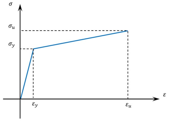 Titoum et al. [69] proposed an idealized bi-linear stress–strain curve for simulating the reinforcing steel rebar behavior as shown in Figure 7. By giving the ultimate stress (), ultimate strain (), yield stress (), and yield strain (), the stress–strain response was created. For a numerical simulation, using the idealized curves is far more stable, therefore, it was used in this study. In accordance with ASTM A615 [70], experimental tests in tension were conducted to determine the characteristic values of the yield and ultimate stresses. These results are shown in Table 4. Using Hook’s law, the modulus of elasticity () was computed as dividing the yield stress by the strain of reinforcing rebar. The Poisson’s ratio for the reinforcing rebar was set as 0.3. Equations (8)–(10) were employed to convert experimental test results into true stress () and true strain () corresponding values in order to model the reinforcing rebar material in ABAQUS software [54,71]. Table 5 presents the stress and strain conversion values. Using the analytical equations below, the engineering stress and strain (i.e., and ) were transformed to true stress and strain: