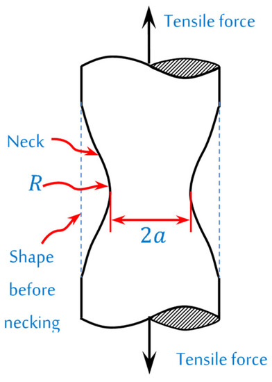where ; ; = first principal stress; = second principal stress; = third principal stress; = radius of circumferential notch (Figure 8); = radius of rebar necking cross-section (see Figure 8); = original radius of the reinforcing rebar.