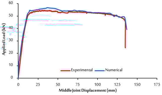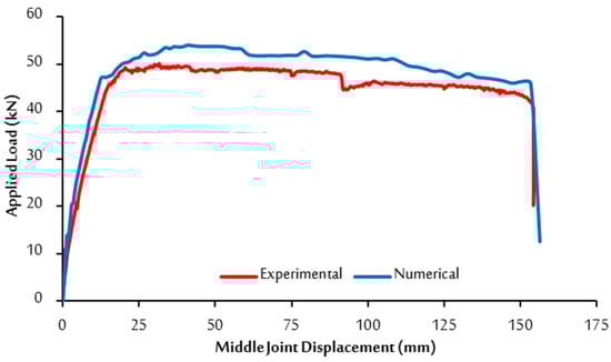 Comparison of the experimental and numerical load–displacement response of the RuC frame.