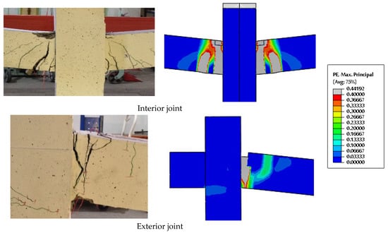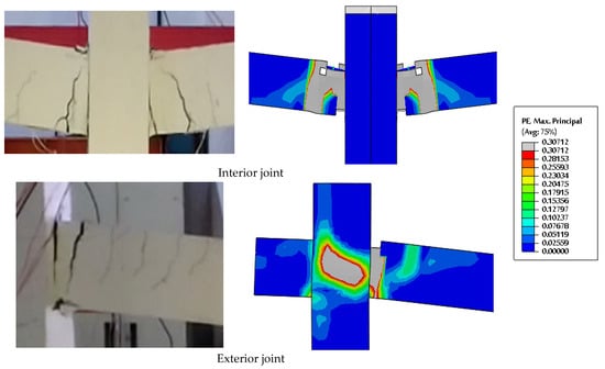 The FE analysis produced extremely good results when compared to the results of the experimental tests. Table 8 compares the measured values of the experimental and numerical specimens, in terms of maximum loads (), displacements (), and the area under the load–deflection curve (i.e., ). The outcomes demonstrated the ability of the FE models to accurately simulate the response of the tested specimens. Regarding the load–deflection relationship shown in Figure 11 and Figure 12, for the NC and RuC specimens, respectively, the FE simulation results agreed very well with the experimental findings. So, the whole load–deflection characteristic can be simulated by the FE for the NC and RuC frames. It is important to note that the CDP model does not allow for the graphical representation of crack formation. The authors who created this model [55], however, claimed that they made the assumption that cracking starts when the maximum principal plastic strain’s (PE, Max Principal) sign is positive or the compressive equivalent strain (PEEQC) and tensile (PEEQT) values are greater than zero [54]. Figure 13 and Figure 14 show that the experimental failure mechanism and fracture pattern exhibited in the NC and RuC specimens, respectively, matched the FE findings. Thorough explanation of the failure modes and crack pattern development of experimental specimens can be found in the publication by Alshaikh et al. [47]. According to crack patterns, the flexural failure mode was dominant in all the models. At the middle and ends of the two-bay specimens, flexural cracking started and expanded at tension fibers of the locations of maximum bending moments.