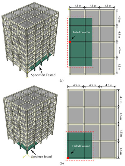 - Huang, H.; Huang, M.; Zhang, W.; Guo, M.; Liu, B. Progressive collapse of multistory 3D reinforced concrete frame structures after the loss of an edge column. Struct. Infrastruct. Eng. 2022, 18, 249–265. [Google Scholar] [CrossRef]
