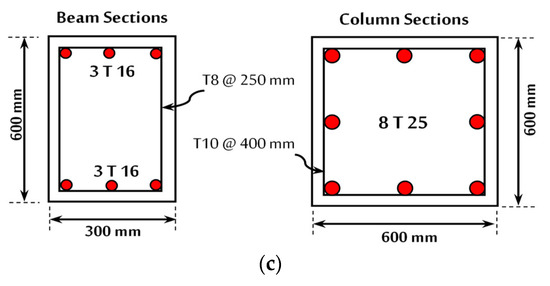 The 10-story building considered in this study has a footprint of 3 bays by 4 bays, as illustrated in Figure 2. The story height is 3.0 m, while the bay span length in both orthogonal directions is 4.5 m, as depicted in Figure 2. The structure is situated in a non-earthquake zone. In addition, the RC building was designed according to ACI 318-11 [52], and ASCE [1] with the requirements of Category “A” for seismic design (i.e., the lowest seismic risk category). Uniform distributed load was applied to the slab surfaces for more realistic modelling. The living load and the superimposed dead load (i.e., tiles, ceiling, ducts, partitions, etc.) were 4.79 kN/m2 and 2.0 kN/m2, respectively, which were applied on floor slabs. The floor finishing loads were composed of four layers: (1) marble tiles with a thickness of 25 mm and a weight of 23 kN/m3; (2) cement mortar with a thickness of 25 mm and a weight of 20 kN/m3; (3) sand with a thickness of 50 mm and a weight of 18 kN/m3; and (4) plaster with a thickness of 15 mm and a weight of 20 kN/m3. A uniform distributed load of 8.7 kN/m was used to simulate the non-structural load (i.e., façade components), which affected all exterior RC beams. The façade components for the internal and external walls were carried out by two layers of 150 mm thick traditional concrete hollow-block with a weight of 17 kN/m3 and 50 mm of thick rockwool with a weight of 0.5 kN/m3. Considering the applying loads and the design standard requirements, the typical column and beam dimensions were 600 mm in depth by 600 mm in width and 600 mm in depth by 300 mm in width, respectively, on all the stories. Two-way solid slabs were designed with 120 mm in thickness for all the stories. After loading calculations and cross-section calculations for RC members, the commercial software ETABS (version 17) [53] was used in the structural analysis of this study to estimate all the influential forces on members (i.e., axial loads, shear forces, flexural bending moments). Figure 3 shows the structural analysis results of the influential forces on members. The longitudinal reinforcing rebars of columns were 8-T25 with reinforcement ratio, of 1% and T10 stirrups at a spacing of 400 mm. The longitudinal rebars for positive and negative moments in beams consisted of 3-T16 with a reinforcement ratio of 0.3%, while the transverse rebars were T8 @ 250 mm along all the beam lengths. The longitudinal rebars for positive and negative moments in slabs consisted of 5-T10 per meter (i.e., T10 @ 200 mm spacing).