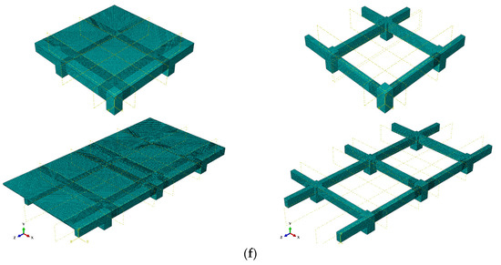 Assignment of loading and boundary conditions of all specimens: (a) NC-COR and RuC-COR; (b) NC-COR-Slab and RuC-COR-Slab; (c) NC-MID and RuC-MID; (d) NC-MID-Slab and RuC-MID-Slab, (e) applying of downward displacement; and (f) meshing of specimens.