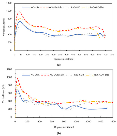 Figure 18 illustrates the vertical load and horizontal reaction force versus the vertical displacement of specimens of scenario A and B with and without a slab for various loading processes and resistance mechanisms. One may observe that the initial portion of the load–displacement curves is linear elastic, thus representing the uncracked concrete. After the start of concrete cracking, the slope of the load–displacement curves displayed nonlinear behavior. All specimens continued to deflect while the applied load was increasing. The situation then remained unchanged until the reinforcing rebars yielded. A dramatic decrease in the resisting force was seen after the maximum vertical loads, as depicted in Figure 18. During the first analysis step (i.e., before removing the column), the vertical load increased to about 300 and 400 kN for the specimens of scenarios A and B, respectively, without any vertical displacement. In the second step of the analysis, it is noticed that the displacement begins to increase gradually with the increase of the vertical load as shown in Figure 18. The failure mode and crack pattern of all the specimens are shown in Figure 19. Regarding the scenario “A” specimens, the sections of the beams and slab close to the failed column were exposed to a positive flexural bending moment in the primary mechanism stage (i.e., the elastic stage), and the concrete began cracking at the bottom surface. Additionally, the areas of the beams and slab next to the neighbouring columns had a negative flexural bending moment, and the concrete began cracking at the top surface, as shown in Figure 19a through Figure 19d. For the scenario “B” specimens, the longitudinal reinforcing bar in the sections of the beams next to neighbouring columns started to experience fewer stresses as the joint flexural cracks widened, while the stresses on the bar in the sections of the beams close to the failed column increased quickly. This demonstrated the conversion of the specimen’s resistance mechanism to a cantilever beam as shown in Figure 19e through Figure 19h. For scenario “B” specimens, pull-out failure was noticed in the top reinforcing rebars of beams in the beam–column joints at the failed column area. At the corner joint, the failed column was almost completely separated from the beams. The maximum vertical loads were 744.49, 647.73, 985.61, and 811.06 kN for NC-MID, RuC-MID, NC-MID-Slab, and RuC-MID-Slab, respectively, which were attained at a deflection of 40.55, 72.44, 40.55, and 40.53 mm for NC-MID, RuC-MID, NC-MID-Slab, and RuC-MID-Slab, respectively. Regarding the scenario “B” specimens, the maximum vertical loads were 692.34, 616.39, 978.51, 817.76 kN for NC-COR, RuC-COR, NC-COR-Slab, and RuC-COR-Slab, respectively, which were attained at a deflection of 42.59, 42.64, 43.26, and 43.79 mm for NC-COR, RuC-COR, NC-COR-Slab, and RuC-COR-Slab, respectively.