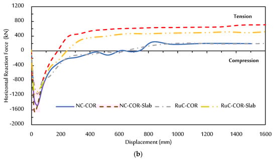 Figure 20 shows the horizontal reaction force-displacement of all specimens, a negative horizontal reaction force indicates the specimens under compression force, and a positive horizontal reaction force indicates the specimens under tension force. The general failure behavior can be divided into three phases, namely: an elastic phase, compressive arch/membrane actions (CAA/CMA), and tensile catenary/membrane actions (TCA/TMA), as can be seen from the load–displacement responses of all specimens in Figure 20. The first stage (i.e., elastic stage) was during the uncracked concrete stage before the start of cracking. Then, after the concrete cracked, CAA/CMA was activated. The beginning of the catenary stage can be demonstrated by locating the point at which the horizontal reaction force equals zero, i.e., when the horizontal reaction force falls to zero and begins to transform from negative (i.e., compressive = CAA/CMA) to positive (i.e., tension = TCA/ TMA), as shown in Figure 20. The maximum capacities of all the specimens happened prior to the development of the TCA/TMA. The TCA and TMA forces (i.e., the catenary mechanism) in the longitudinal reinforcing rebars of the beams and slabs, respectively, were a major contributor to the progressive collapse resistance. Only the reinforcement of the slab and two-bay beams (in scenario “A”) or perpendicular beams (in scenario “B”) along the free edge considerably contributed to the resistance of the progressive collapse as a result of the boundary restrictions and the disproportionate deformation. The final damage state of all the all specimens is shown in Figure 21. As a result of the start of concrete crushing in beams and slabs close to the failed column, the horizontal compressive reaction (CHR) increases nonlinearly, as shown in Figure 20. The maximum CHR for the specimens without a slab, NC-MID, RuC-MID, NC-COR, and RuC-COR, were −1036.24, −786.42, −1470.75, and −1164.32 kN, respectively, at a deflection of 72.47, 114.13, 42.59, 42.64 mm (see Figure 20). With increased deflection, severe cracks had developed near to the failed column, which caused the CHR to start to decrease. Concrete splitting was noticed in the end of beams, and concrete crushing increased in the two-bay beam as well as the transverse beam with a further increase in the deflection which led to failure in the area of column removal (see Figure 21a–d).