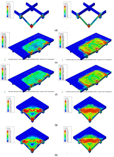 Concrete damages for all specimens: (a) NC-MID; (b) RuC-MID; (c) NC-COR; (d) RuC-COR; (e) NC-MID-Slab; (f) RuC-MID-Slab; (g) NC-COR-Slab; and (h) RuC-COR-Slab.