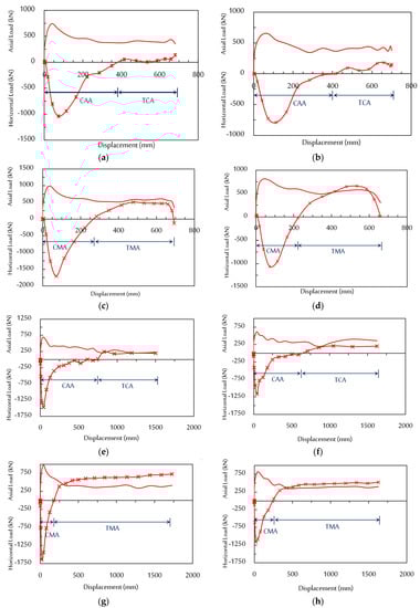 Horizontal reaction force–displacement curves: (a) Scenario “A” specimens and (b) Scenario “B” specimens.