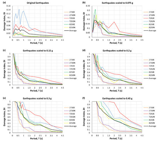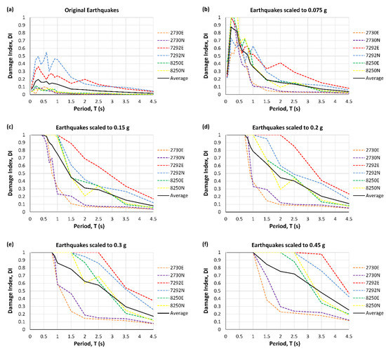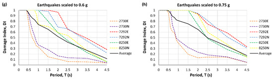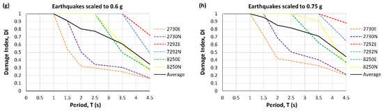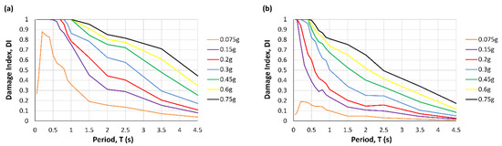 At low values of PGA, the DI initially grows by increasing the period up to 0.2 s and then decreases (Figure 3b and Figure 4b). For larger PGAs, the high damage index decreases from about 0.5 to 1 s (Figure 3 and Figure 4c–h). In addition, as expected, the graphs show DI increases with the increase in PGA.