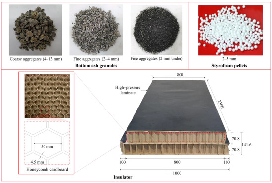 OPC, ground-granulated blast-furnace slag (GGBS), and fly ash (FA) were used as the cementitious materials in the insulating concrete. The specific gravity and specific surface area were 3.15 cm2/g and 3260 cm2/g, respectively, for the OPC; 2.94 g/cm3 and 4355 cm2/g, respectively, for the GGBS; and 2.2 g/cm3 and 4170 cm2/g, respectively, for the FA. To reduce the thermal conductivity of the concrete, insulating concrete was produced with bottom ash granules and Styrofoam pellets (Figure 1). The bottom ash granules were used as the fine and coarse aggregates. To satisfy the particle-size distribution specified in ASTM C 330 [13], the bottom ash granules with sizes of <2 and 2–4 mm were combined with a ratio of 7:3 by weight. The surface density and fineness of the combined fine aggregates were 1790 kg/m3 and 2.74, respectively. For the bottom ash granules used as coarse aggregates, the maximal size was 13 mm, and the surface density and fineness were 1180 kg/m3 and 6.55, respectively (Table 1). Styrofoam pellets with sizes between 2 and 5 mm were used, and their surface density was 33 kg/m3. As an insulator, paper honeycomb cardboard with laminate attached to the top and bottom was used. The density, specific heat, and thermal conductivity of the paper honeycomb cardboard were 180 kg/m3, 1.22 J/g·K, and 0.1 W/m·K, respectively. The corresponding values of the laminate sheets were 900 kg/m3, 1.44 J/g·K, and 0.3 W/m·K, respectively.