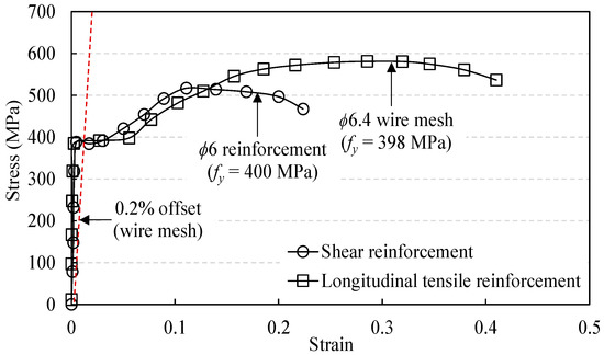 As indicated by Table 2, the designed compressive strength () of the insulating concrete was 12 MPa. The mixture proportion of insulating concrete was determined according to the test results obtained by Kim et al. [5]. Kim et al. [5] reported that lightweight aggregates and Styrofoam pellets were effective in reducing the low thermal conductivity of concrete and recommended that the optimal Styrofoam pellet volume ratio was 7.5% considering the insulating concrete compressive strength () of more than 10 MPa. On the basis of the test results obtained by Kim et al. [5], the water-to-binder ratio and unit binder content were selected to be 30% and 450 kg/m3, respectively. In each mixture, the replacement ratios of the binders were 30% for OPC, 50% for GGBS, and 20% for FA. The compressive strength () of the insulating concrete was measured using cylindrical samples with dimensions of 100 mm (diameter) and 200 mm (height), cured simultaneously with the insulation-panel specimens. The average was 12.3 MPa, and the average unit weight of concrete () was 1408 kg/m3. As shown in Figure 2, the 6.4 mm diameter wire mesh with a mesh size of 100 × 100 mm2 used as longitudinal tensile and compressive reinforcements did not exhibit a clear yield point or plateau. Thus, the yield strength of the wire mesh was determined using the 0.2% offset method. The 6 mm diameter reinforcement used as shear reinforcement exhibited a clear yielding point. The yield strength, tensile strength, and elastic modulus of the wire mesh were 398, 530, and 190,776 MPa, respectively, and those of the shear reinforcement were 400, 517, and 198,000 MPa, respectively.