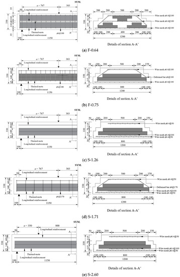 The width () and height () of all the specimens were 1200 and 330 mm, respectively. The length () between the two simple supports was 2300 mm. The shear span () was 350 mm for = 1.17, and 767 mm for = 2.56.