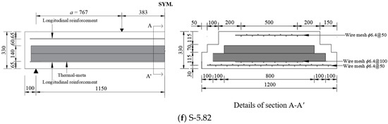 The longitudinal tensile () and shear () reinforcement ratios of the specimens were 0.0015 and 0.00053, respectively, which were calculated from the cracking moment (1.2 ) and minimal amount of shear reinforcement () specified in KCI 2017 [14]. Consequently, using , the actual values of were 0.64 for the integral-unit specimens and 0.75 for the divided-unit specimens. The main parameters of the specimens with > 1.0 were and ; was set as 0.5, and 1.0 , and was set as 1.17 and 2.56. To keep higher than 1.0, was set to be 0.0036. Consequently, according to , the actual values of varied between 1.26 and 5.82. In the specimen names, the letter refers to the designed governing behavior type (F = flexure and S = shear), and the number indicates the value of . For example, F-0.64 corresponds to a specimen with = 0.64 that was designed to be governed by flexure.