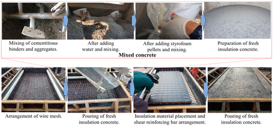With the global interest in the inherent fire resistance of organic insulators, precast concrete insulation panels overlain with two concrete wythes and an insulator were studied [7,8,9,10]. Many researchers [7,8,9,10] emphasized that precast concrete insulation panels should be designed to resist flexural loading due to wind, although they are nonstructural members. Thus, most studies have focused on flexural tests. Pessiki and Mlynarczyk [7] emphasized that two concrete wythes and an insulator act independently, resulting in low cracking resistance and a flexural moment. To act together in two concrete wythes and an insulator, various shear connectors were studied at interfaces between them [8,9,10]. Tomlinson and Fam [8] reported that the flexural behavior of precast concrete insulation panels was governed by the degree of composite action, and the shear connectors installed at interfaces between concrete wythes and an insulator effectively contributed to the composite action. O’Hegarty et al. [9] reported that the composite action developed at the interfaces between concrete wythes and an insulator should be cautiously considered in the flexural design of precast concrete insulation panels. However, previous studies focused on the structural tests of panels simply overlain with two concrete wythes and an insulator. As reviewed by O’Hegarty et al. [9], a further refinement of the details is still needed to retain high composite action and a low heat-transmission coefficient.