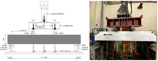 As shown in Figure 5, all the specimens were tested under two-point top loadings using a 2000 kN capacity actuator. All the specimens were supported on a roller at one end and on a hinge at the other end. The applied loads during the test were measured using an actuator system. The vertical deflections in the maximal-moment region were measured using 100 mm capacity linear variable differential transducers installed at the loading points and midspan. To determine whether the specimens yielded, the strains in the wire mesh used as longitudinal tensile reinforcement were measured using electrical resistance strain gauges attached to the maximal-moment region.