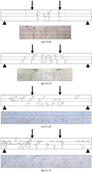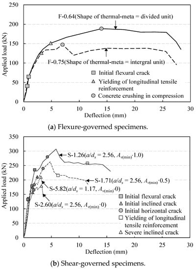 As shown in Figure 6, the failure mode of the insulation-panel specimens was significantly affected by . The crack propagation and failure mode of the specimens with < 1.0 were similar to those of conventional reinforced concrete beams governed by flexure [15]. The initial vertical cracks occurred in the maximal-moment region. Subsequently, as the applied load increased, the vertical cracks propagated toward the compression zone and the simple supports. The height of the vertical cracks that propagated toward the compression zone was approximately 0.85 , regardless of the arrangement type of the honeycomb cardboard. More vertical cracks and a wider region of vertical cracks were observed in the divided-unit specimens than those in the integral-unit specimens. This implies that the larger sectional area of concrete in the tension zone was more effective for dispersing vertical cracks along the panel length. After the peak load had been reached, the vertical cracks were severely widened, and the wire mesh was fractured. The initial vertical cracks of the specimens designed with > 1.0 also occurred in the maximal-moment region; subsequently, diagonal cracks occurred in the shear span as the applied load increased. The number of diagonal cracks in the shear span increased slightly with an increase in , indicating a reduction in or . At the peak load, severely widened diagonal cracks occurred near the reaction and loading top points, and a horizontal crack simultaneously occurred along the embedded honeycomb cardboard. The horizontal-crack lengths of the specimens with between 1.26 and 1.71 ranged from 0.33 to 0.45 L, implying that the effect of on the horizontal-crack length was significant. The horizontal-crack length of the specimens with = 5.82 was 0.8 L, which was approximately twice that of the specimens with between 1.26 and 1.71.