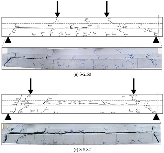 As indicated in Table 4, the initial cracking loads () of the divided-unit specimens were 1.24 times larger than those of the integral-unit specimens. This trend was similar to that of the peak loads () of the specimens. The value of the divided-unit specimens was 189 kN, which was 1.3 times larger than that of the integral-unit specimens. This is because the additional arranged wire meshes for fixing the divided units during concrete casting contributed to the confinement of the compression zone [17]. The initial diagonal cracking load () of the specimens governed by shear increased by a factor of 1.16 when increased from 2.60 to 5.82. This trend was similar to that of the maximal shear loads () of the specimens (Table 5). Additionally, increased with . However, the increasing rate was insignificant for the specimens governed by flexural–shear; it was 1.08 when decreased from 1.71 to 1.26. The values increased with a reduction in , and the decreasing rate was approximately 0.85 for the specimens governed by shear.
