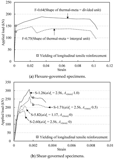 As shown in Figure 8, for the specimens with < 1.0, the wire mesh arranged as longitudinal reinforcement reached its yield strain before the peak load. Specimens with < 1.0 were governed by flexure. However, for all specimens with > 1.0, the wire mesh did not reach its yield strain during the test. The strain in the wire mesh for the specimens with = 1.26 and 1.71 was close to the yield strain, with values of 0.0015 and 0.0017 at the peak loads, respectively. However, after the peak load had been reached, the yield strain was reached at approximately 80% of the peak load. For the specimens with > 2.60, the yielding of the wire mesh was not observed until the termination of the test. These trends indicate that the specimens with = 1.26 and 1.71 were governed by flexural–shear, and that those with > 2.60 were governed by shear. Consequently, ≤ 0.75 was required for the insulation panels governed by flexure.