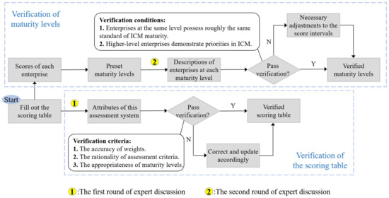 70] developed a framework for assessing the digital maturity of construction site operations. To examine and verify the framework, they conducted a case study on one construction site. The digital maturity of that site was firstly calculated by the proposed framework. Then they discussed, with the assessor, the detailed status of the digitalization of that site as well as the strengths and weaknesses. The consistency between the assessment results and the discussion results verified the proposed framework. Furthermore, the usability and benefits of this framework were also discussed. In this research, we also used expert discussions to verify our proposed assessment system. However, rather than conducting just one discussion with one assessment target, we conducted two rounds of expert discussions with experts from several construction enterprises. The first round was conducted to verify the scoring table and preset the maturity levels. The second round was conducted to verify those preset maturity levels. The overall verification process is shown in