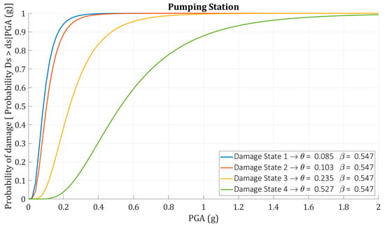 This section presents an implementation of the methodology through a pumping station facility case study. This case study is based on the generic pumping station presented in [51]. The generic pumping station is composed of four main subcomponents that are vital for the functionality of the pumping station: building, pumps, electro-mechanical equipment, and power supply. In this example, the original pumping station is composed of a one-story RC concrete moment frame building, one horizontal pump, mechanical and electrical equipment, and the electric power supply is based on the external commercial power grid. The derived exclusive fragility parameters and curves are as proposed by [51] presented in Figure 2. The probability of damage states (1–4) is derived from the median fragility and the standard deviation.