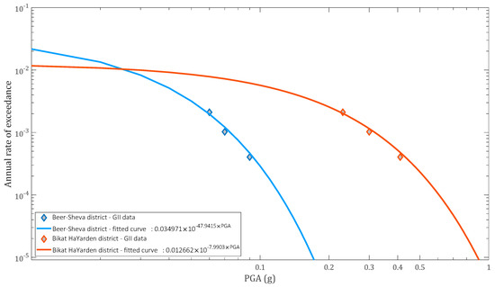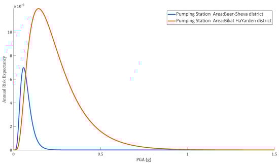 Following the methodology, the risk curves for each region were yielded (Figure 4). The yielded risk curves are the composition of the rate exceedance and expected damage of a specific value of the PGA. Afterward, according to Equation (4), the total risk expectancy for a life span of 50 years (TRE50) was calculated. The TRE50 for the Be’er Sheva region is estimated at USD 364,721, and the TRE50 for the Bik’at HaYarden region it is estimated at USD 2,913,852. The difference between the values is consistent with the assumption that the seismic risk in the Be’er Sheva region is significantly lower than in the Bik’at HaYarden region.
