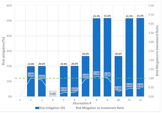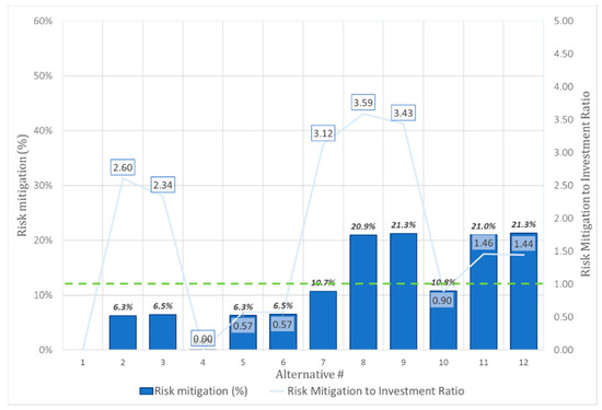 Analysis of the mitigation alternatives by the percentage of risk mitigation and RMIR case of the Be’er Sheva region.
