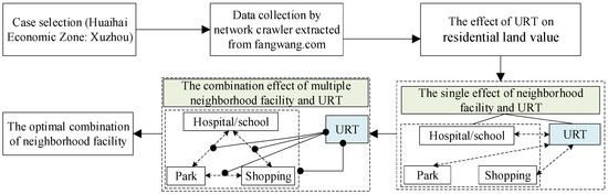 In this way, it is essential to explore the combination effects of different neighborhood infrastructures and URT on urban economic development. Existing research suggests that the combination of hospitals and URT would bring a higher commercial property price [4], but ignored the effect on residential property prices. Meanwhile, few quantitative studies examined the comprehensive impact of different neighborhood infrastructures on housing prices based on a sustainable development perspective to achieve an efficient combination of different functions in the urban area. Multiple regression is the most widespread tool in empirical analysis used to explore the mechanisms between independent and different dependent variables. Meanwhile, this model is essential for determining the optimal combination of many variables. Based on the 1036 properties collected from Xuzhou, China, this study used a multiple regression model to examine the combination effects of multidimensional neighborhood infrastructures (parks, schools, hospitals, and shopping malls) and URT on the prices of properties. This study can help governments make decisions about neighborhood infrastructure and URT based on the sustainable development principle and provide insights into the design of LVC in the financing structure of URT projects.