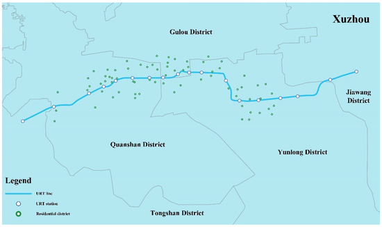 To reduce potential location bias, the cases should be selected from specific economies. Huaihai Economic Zone is an important comprehensive transportation hub in China and is a critical node for the development of “Belt and Road Initiative” [23]. As the central city of this Economic Zone, Xuzhou is an important center of economic, cultural, financial, medical, foreign trade, scientific, and educational activities. In this way, this study chose Xuzhou as the research area (Figure 3). Metro Line 1 of Xuzhou is the first URT line that covers the east–west passenger flow in the whole city. This metro connects the necessary public facilities of the hospital, university, business center, and Xuzhou railway station, significantly stimulating the surrounding land and real estate markets. Meanwhile, the operating URT projects should be selected to guarantee sufficient empirical data. Xuzhou Metro Line 1, which has 18 stations (6 transfer and 12 regular stations), has been in operation since September 2019, indicating that complete research data can be collected.